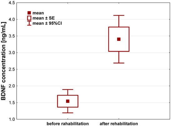 In case of BDNF, we observed its statistically significant increase in the patients serum after a 21-day individual rehabilitation exercise training program, compared to its concentration before the rehabilitation started to (p < 0.001). In the course of 21 days, BDNF levels increased by about 1.86 ± 1.96 ng/mL (95%CI: 1.22–2.51) (Figure 3, Table 2).