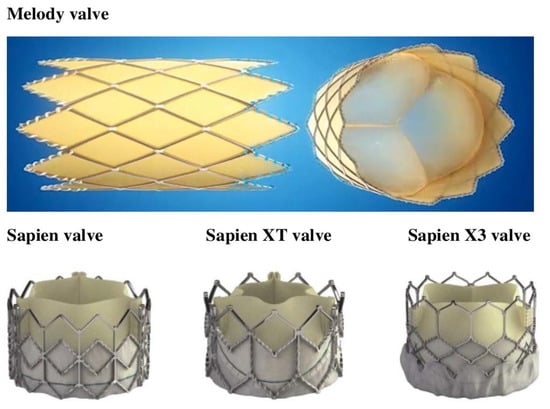 Transcatheter pulmonary valve implantation (TPVI) or percutaneous pulmonary valve implantation (PPVI), originally reported in the late 1990s, is a major advancement in the percutaneous management of congenital heart disease (CHD) []. Due to the poor long-term performance of the biological valve systems, most individuals with right ventricular outflow tract disease require numerous treatments or operations throughout their lives, which makes TPVI an attractive and less invasive substitute for reoperation of right ventricular outflow tract (RVOT) dysfunction in patients with CHD []. Initially, TPVI was only available to patients with a defective right ventricle-to-pulmonary artery conduit; however, it has since been made available to individuals with bioprostheses, small expandable conduits, and native RVOTs [,]. The Edwards Sapien (Edwards Lifesciences, Irvine, CA, USA) and the Melody Medtronic (Medtronic Inc., Minneapolis, MN, USA) valves are the most commonly used transcutaneous pulmonary valve systems among the commercially available and approved valves for interventional TPVI in the United States (Figure 1) [,].