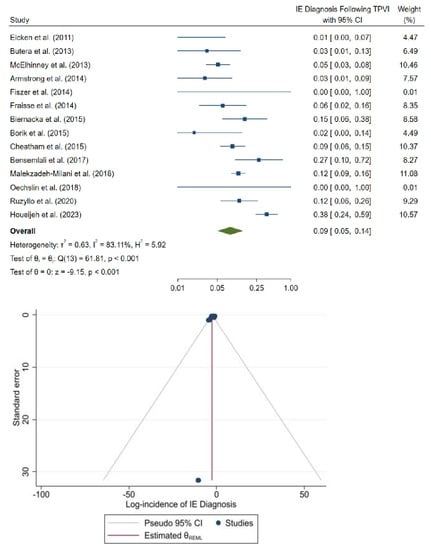 The natural log link of study-specific IE incidences was used to obtain the pooled incidence of IE. Study-specific standard errors were based on the number of IE diagnoses following TPVI and study-specific sample sizes. Standard error was calculated as the square root of (1/k − 1/N), where k represents IE diagnoses and N represents sample size. To allow for calculation of log incidence and its standard error in studies reporting no incidence of IE diagnoses, a continuity correction was used. Although continuity corrections address concerns about excluding zero-event studies, their addition of pseudo-observations may bias conclusions in studies with small sample sizes []. Therefore, to minimize bias, we used a continuity correction of 0.001. Further, to evaluate any bias resulting from our use of this continuity correction, we conducted several sensitivity analyses that included a continuity correction of 0.5, the exclusion of zero-event studies, as well as estimation of random-effect Poisson and binomial regression models that allow for zero-event studies.