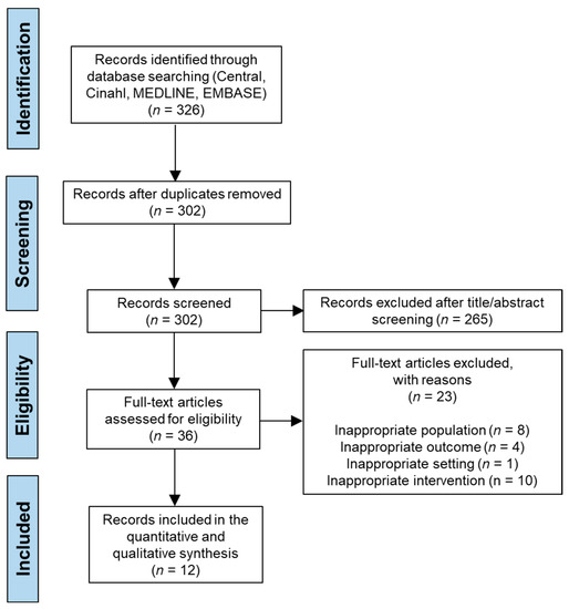 A total of 326 studies were retrieved from the Cochrane Central Register of Controlled Trials, Ovid Medline, Proquest, and Cinahl database search. After removal of duplicates, 302 articles were screened according to the inclusion/exclusion criteria for full-text reading. After reviewing titles and abstracts, 265 articles were removed, and out of the remaining 36 studies, the full-text reading excluded 24 studies based on the PICOS framework of this systematic review, including inappropriate population, outcome measure, setting, and intervention. No additional studies were found from reference lists in included studies. Twelve studies were included in our final systematic review [10,14,21,25,28,29,30,31,32,33,34,35], and the PRISMA flow diagram is shown in Figure 1.