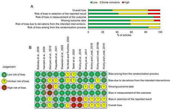 The overall risk of bias across all domains assessed was low in only 33.3% of the studies, but 50.0% and 16.6% of studies were judged to contain some concerns to high risk of bias, respectively (Figure 2A,B). While most studies included details of randomization, 16.6% of studies raised some concerns due to the extremely small size of participants (7–15 patients in each group) or it was unclear how randomization was achieved (Figure 2A,B). Missing outcome data, bias due to deviations from the intended interventions and bias in the selection of the reported results were all judged to have some risk of bias. Overall, only two studies had no judged risk of bias [21,28], whereas all of the other studies had some bias, ranging from some concerns to high risk of bias.
