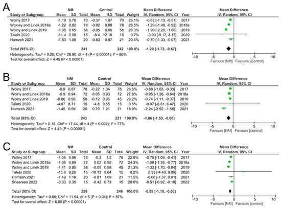 Meta-analysis results of BCTQ in included studies. (A) Meta-analysis of BCTQ-SSS (symptom severity scale). (B) Meta-analysis of BCTQ-FSS (functional status scale). (C) Meta-analysis of combined SSS and FSS in included studies. Results reflected significant improvements in the NM-treated groups, reflected by lower scores, compared to controls.