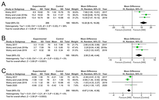 Meta analysis of nerve conduction studies. (A) SCV (sensory conduction velocity) and (B) MVC (motor conduction velocity) increased significantly, while (C) motor latency was significantly reduced by NM.