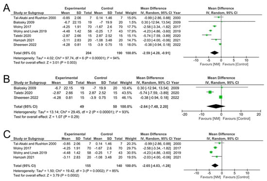 Meta-analysis of pain scores showed a significant reduction in pain after NM compared to control. (A) Data from all studies combined into the meta-analysis. Individual data from studies using the (B) visual analogue scale or the (C) numerical pain rating scale.