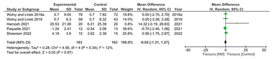 Meta-analysis of grip strength demonstrated no significant improvements in the NM-treated group.