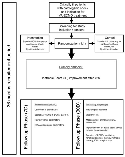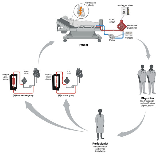 ECMOsorb is an interventional, prospective, two-arm randomized, controlled, triple-blinded trial. ECMOsorb will determine if the early, additional use of CytoSorb® (CytoSorbents Europe GmbH, Berlin, Germany) is superior to standard ICU–treatment alone in patients with cardiogenic shock under VA–ECMO support. Figure 1 shows the flowchart of the trial. For patients in the interventional study arm, the CytoSorb® hemadsorption device will be integrated into the VA–ECMO circuit within 6 h after ECMO implantation by a cardiac technician (perfusionist). The intervention phase is set for 72 h. The device will be changed every 24 h.