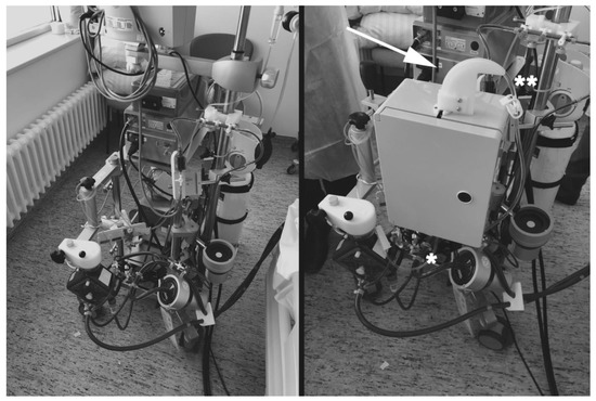 Left side: regular VA–ECMO (veno-arterial extracorporeal membrane oxygenation) machine set–up at the trial site from the manufacturer Getinge® (Rastatt, Germany) that is part of the routine clinical use, including the BE–PLS 2050 Getinge® (Rastatt, Germany), the Rotaflow RF–32 centrifugal pump (Getinge®, Rastatt, Germany), the QUADROX® oxygenator (Getinge®, Rastatt, Germany) and standard tubing. The system is operated via the Rotaflow console (Getinge®, Rastatt, Germany) mounted on the Rotaflow Sprinter Unit with heater unit HU 35 (Getinge®, Rastatt, Germany) and manual blender. Right side: trial set up that includes the black box (CytoLock® System, Jena, Germany) attached to the frame of the ECMO by a clamp mechanism. To avoid kinking of the tubing going in (*) and out (**) in the proximity of the box, a customized guiding contraption has been fitted (arrow, CytoLock® System).