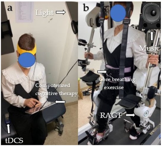 One combination involves simultaneous application of 1 to 2 mA of transcranial direct current stimulation (tDCS) and exposure to 10,000 lx of light while engaging in a medium-difficulty game targeting memory and attention through computerized cognitive therapy, all in a comfortable seated position. The other combination involves performing 20% body weight support during comfortable-speed robotic-assisted gait training (RAGT), core breathing exercises at a fixed rate of 8–10 cycles per minute, and listening to relaxing music at a frequency of 40 Hz while standing [] (Figure 2).