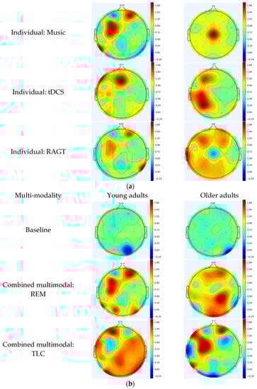 Using computerized cognitive therapy, young adults exhibit event-related synchronization (ERS) in the frontal region, which controls cognitive and memory functions []. In contrast, older adults demonstrate ERS activation in the frontal, temporal (primary functions include memory and understanding), and parietal (responsible for sensing and perception) regions [,]. During light therapy, young adults show ERS in the parietal region, whereas older adults show ERS in the occipital region (which serves as the center for processing visual stimuli) []. In music therapy, young adults demonstrate ERS in the frontal, parietal, and temporal regions, whereas older adults exhibit ERS in parietal areas. Young and older adults exhibit ERS in the frontal and parietal regions during REM. In TLC, young and older adults exhibit ERS in the frontal, temporal, and parietal regions of the brain. In tDCS, young and older adults exhibit ERS in both temporal and parietal regions. In the RAGT, young adults displayed ERS in the frontal, temporal, and parietal regions, whereas older adults showed ERS in the frontal, parietal, temporal, and occipital regions (Figure 3a,b).