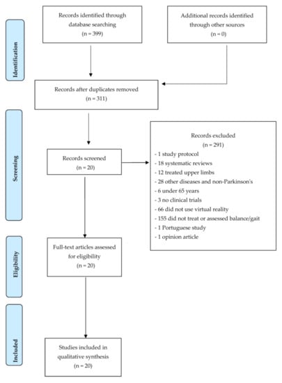 - Lei, C.; Sunzi, K.; Dai, F.; Liu, X.; Wang, Y.; Zhang, B.; He, L.; Ju, M. Effects of virtual reality rehabilitation training on gait and balance in patients with Parkinson’s disease: A systematic review. PloS ONE 2019, 14, e0224819. [Google Scholar] [CrossRef]