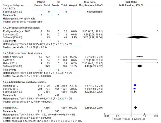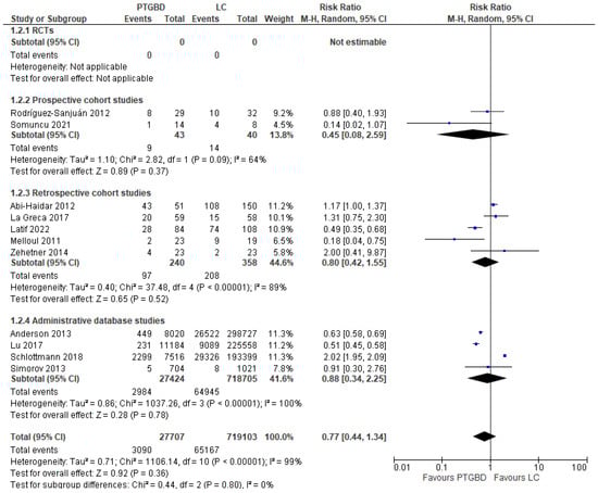 - Studies from administrative databases: the mortality was 2.37% in the group undergoing cholecystectomy vs. 13.92% in the group undergoing PTGBD, and this difference was statistically significant (RR4.10 95%CI [2.29 to 7.33]; p < 0.00001).