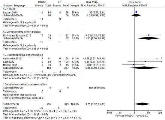 A subgroup analysis of three studies with laparoscopic surgery (368 patients) showed similar results: 5.18% with laparoscopic EC compared with 8.57% with PTGBD. However, the result did not reach statistical significance (RR 1.36 95% CI [0.64 to 2.87]; p = 0.42)