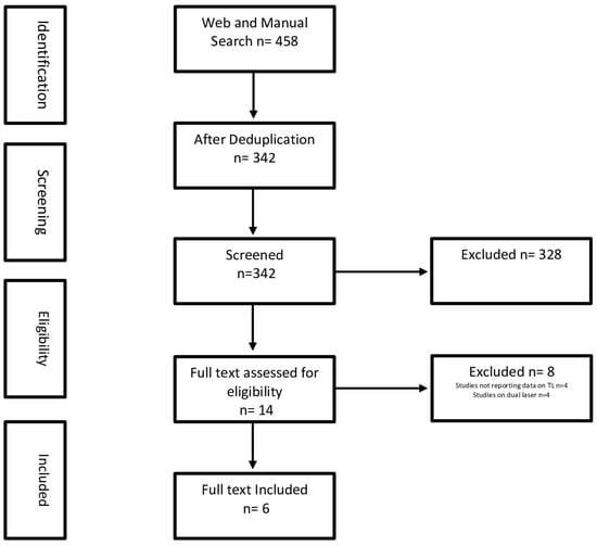 Titles and abstracts from 458 articles were reviewed, and six full texts were finally selected for this SR (Figure 1). All the included studies were retrospective series (five single centers and one multicenter series), and were published between 2011 and 2022 [,,,,,]. A Thulium:YAG laser and a TFL were used in four [,,,] and two [,] series, respectively. Most of these studies aimed to assess TL safety and effectiveness in conservative UTUC treatment, and reported the short-term complications rate and oncological outcomes. TL was not directly compared with other laser or surgical alternatives in five studies. However, Wen et al. [] compared oncological outcomes of the 32 patients treated with TL with a control group of 107 patients who underwent radical nephroureterectomy for UTUC in the same center. Moreover, Defidio et al. [] reported differences between TLs and Holmium:YAG in laser properties through a Likert score for laser performance indicators (e.g., fiber tip stability, fiber tip precision, etc.).