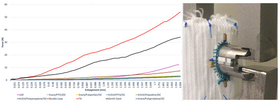 After 2 mm, the LISF radial strength was 12.27 ± 6.08 N. Concerning PMSG, the highest radial strength was observed with a double loop of the snare (7.44 ± 2.9 N).