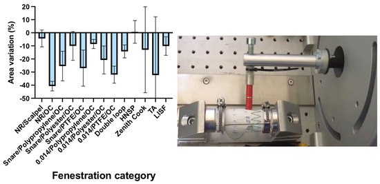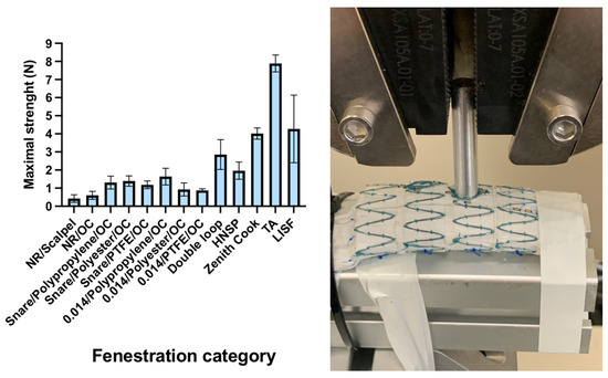 - Jayet, J.; Heim, F.; Canonge, J.; Coggia, M.; Chakfe, N.; Coscas, R. Mechanical Behaviour of Fenestrations in Current Aortic Endografts. Eur. J. Vasc. Endovasc. Surg. 2021, 62, 945–952. [Google Scholar]