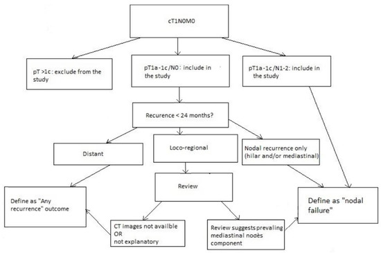 All operated patients in which the final pathology showed unexpected hilar or mediastinal nodal involvement (hence depicting an upstaging scenario) and/or presented an isolated nodal recurrence within 24 months after lobectomy with pN0 status were defined as nodal failure cases. Patients who presented instead both nodal recurrence and extranodal progression (e.g., hilar stumps disease, contralateral or extrathoracic metastases) were considered nodal failure cases only if the nodal recurrence was the main feature of disease progression. Nodal failure was hence set at the primary outcome of the study. Secondary outcomes were overall survival and progression-free survival.