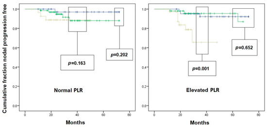 Kaplan–Meier curves of nodal-recurrence-free survival in patients with initial pN0 status. Left scheme: patient with normal platelet-to-lymphocyte ratio (PLR); right scheme: patients with elevated PLR. Blue line: pT1a subgroup; Green line: pT1b subgroup; Yellow line: pT1c subgroup. Comparison is given as pT1a vs. pT2b, and pT1c vs. pooled pT1a/pT1b survival, for graphical needs.
