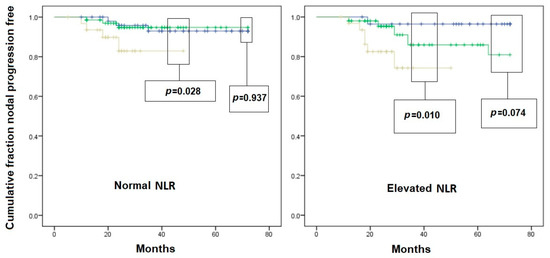 Kaplan–Meier curves of nodal-recurrence-free survival in patients with initial pN0 status. Left scheme: patient with normal neutrophil-to-lymphocyte ratio (NLR); right scheme: patients with elevated NLR. Blue line: pT1a subgroup; Green line: pT1b subgroup; Yellow line: pT1c subgroup. Comparison is given as pT1a vs. pT2b, and pT1c vs. pooled pT1a/pT1b survival, for graphical needs.