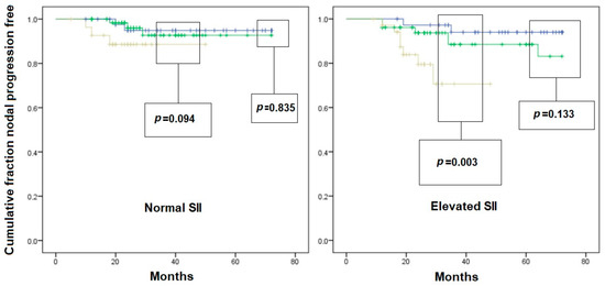 Kaplan–Meier curves of nodal-recurrence-free survival in patients with initial pN0 status. Left scheme: patient with normal Systemic Inflammation Index (SII); right scheme: patients with elevated SII. Blue line: pT1a subgroup; Green line: pT1b subgroup; Yellow line: pT1c subgroup. Comparison is given as pT1a vs. pT2b, and pT1c vs. pooled pT1a/pT1b survival, for graphical needs.