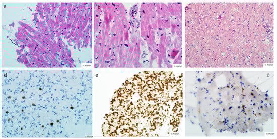 Morphological signs of lymphocytic myocarditis according to the histological (upper row) and immunohistochemical (lower row) studies of the biopsy specimens of the right ventricular myocardium. Hematoxylin-eosin staining (a,b), according to Van Gieson (c), immunohistochemical preparations with antibodies to CD3 ((d), more than seven positive cells), CD45 ((e), more than 14 positive cells), CD68. Interstitial (a,d,e) and perivascular (b) lymphocytic and macrophage (f) infiltration; perivascular (b) and small focal (c) fibrosis.