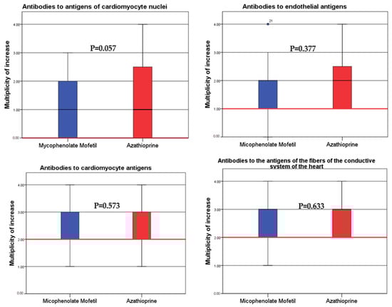 The dynamics of the anti-heart antibody titers was assessed as a result of the treatment. The titers of all the types of antibodies decreased in both groups. However, by the end of the observation period, a significant decrease was observed in the titers of antibodies to antigens of cardiomyocytes, and endothelium and fibers of the conducting system were noted only in the MM treatment group (p < 0.05).
