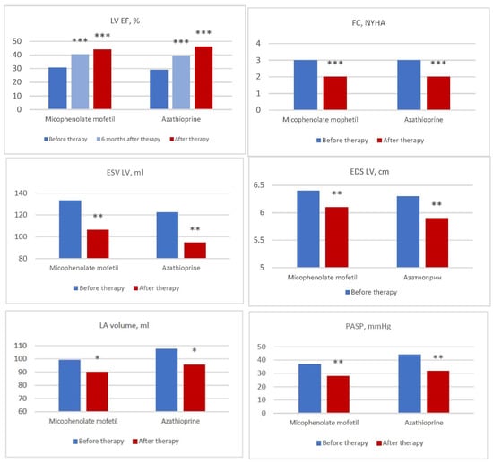 Dynamics of the NYHA FC and basic echocardiography parameters in the patients with myocarditis in the groups of mycophenolate mofetil and azathioprine. LV EDD—end-diastolic size of the left ventricle, LV EDV—end-systolic volume of the left ventricle, LV ESV—end-systolic volume of the left ventricle, LVEF—left ventricular ejection fraction, FC—functional class, LA—left atrium, PASP—systolic pressure in the pulmonary artery, NYHA—the New York Heart Association Functional Classification; *—p < 0.05, **—p < 0.01, ***—p < 0.001.