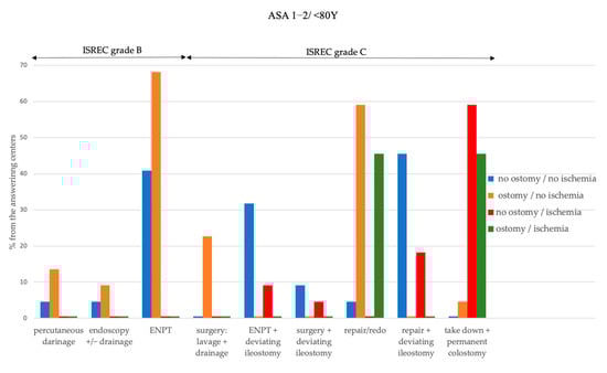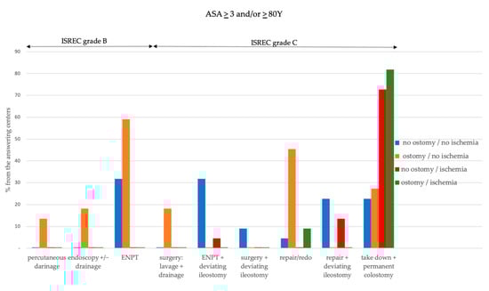 In summary, according to the present survey, a CAL may be managed in the presence of primary ostomy and in case of good vascularization as a grade B leakage. Preservation of the anastomosis should be considered in young and fit patients, independently of its intra- or extraperitoneal localization, and in elderly and/or frail patients in case of extraperitoneal localization. The absence of a deviating ostomy in young and fit patients should not be considered an absolute criterion to manage a leaking anastomosis as grade C. A grade B management should be evaluated in these patients. According to the ISREC definition, patients undergoing grade B management should have a moderately impaired clinical condition. In case of a severely impaired, life-threatening clinical condition, a step up to grade C management should be considered regardless of the former criteria. Grade C management should be considered in all patients in case of ischemic bowel, irrespective of the presence of an ostomy, as well as in elderly and/or frail patients without ostomy protection, irrespective of perfusion status. ENPT may be primarily used to salvage a leaking anastomosis as long as the drainage of a pelvic abscess is guaranteed. In cases of grade C management, Hartmann’s situation may be avoided in favor of anastomotic redo or repair in order to preserve the intestinal continuity and avoid a permanent ostomy; the latter has been previously shown to increase in the last decade [].
