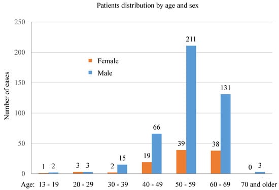 Of the 533 LTs performed in the studied period, 431 patients (80.9%) were male, while 102 (19.1%) were female. The mean age of this series was 55.1 (±8.7 years), being 55.2 (±8.4 years) for males and 54.7 (±9.9 years) for females. Figure 1 shows the distribution by age and sex, in which it can be observed that the majority of patients were between 40 and 69 years of age (males, 94.6% and females, 94.1%). Of the male patients, 94.7% were within the 40–69 year age group, and this percentage was almost the same for the female patients (94.1%). Thus, this age group represented, without distinction of gender, the largest number of transplants performed (504 transplants out of 533).