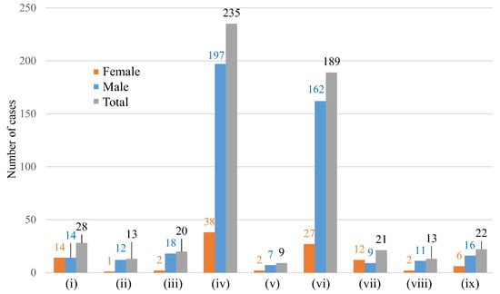 Indications of LT by type of pathology are summarized in Figure 2. Parenchymal chronic liver disease (424 cases ((iv) + (vi) in Figure 2) corresponding to 79.5% of total cases) stand out, followed by neoplastic disease (192 cases, ((v) + (vi) in Figure 2), 37.2%). Other pathologies were present in fewer than 6% of the cases: cholestatic chronic liver disease (5.3%), chronic vascular liver disease (2.4%), biliary-tree vascular disease (3.8%), acute and/or subacute liver failure (3.9%), and metabolic and/or genetic disease (2.4%). Other causes such as graft failure, thrombosis, or incompatibility made up 4.1% of the cases.