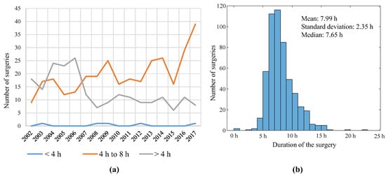 (a) Duration of the surgeries per year and (b) distribution of the duration of the surgeries.