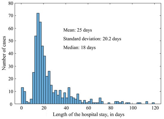 It can be observed that, in this series, most patients had a grade II Clavien−Dindo classification. These were patients who required pharmacological treatment other than grade I (i.e., deviations from the normal postoperative period that do require open and/or endoscopic reoperations, use of blood transfusions or blood products, or parenteral nutrition). This is consistent with the value of the average hospital stay (Figure 6).