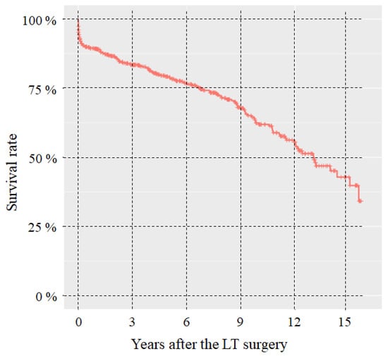 The survival rate was analyzed by defining the follow-up time as the difference between the date of transplantation and the date of exitus, if it occurred, or the closing date of the present study (31 December 2017). There are 158 exitus, with 13 years of median survival. The 5-year survival rate was 79.3%, decreasing to 61.9% at 10 years. The survival rate after the LT surgery is depicted in Figure 7.