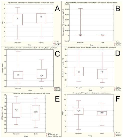 No significant differences between groups of cystic and non-cystic lesions due to: (A) age; (B) post-operative PTH serum concentration; (C) preoperative creatine serum concentration; (D) preoperative creatine in urine sample; (E) preoperative GFR (glomerular filtration rate); (F) preoperative TRP (tubular reabsorption of phosphorus).
