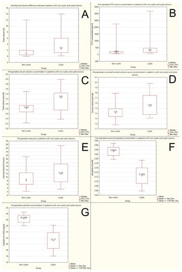 Differences between groups of cystic and non-cystic lesions due to: (A) volume; (B) preoperative PTH (parathormone) serum concentration; (C) preoperative serum calcium concentration; (D) preoperative ionized calcium serum concentration; (E) preoperative calcinuria; (F) preoperative serum phosphate concentration; (G) preoperative calcidiol.