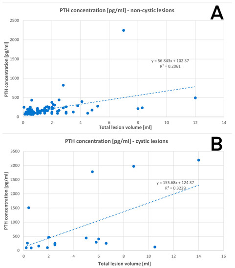 Cystic parathyroid lesions were related to a higher PTH serum concentration in relation to non-cystic lesions of comparable volume. The data are shown in Figure 3A,B.