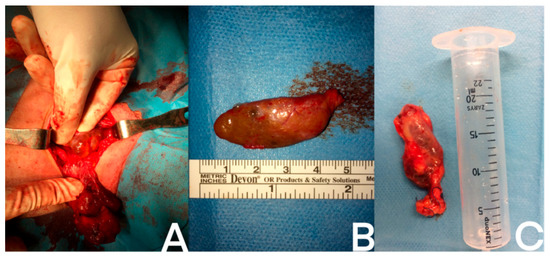 Examples of different cystic parathyroid lesions: (A) intraoperative photo of the cystic parathyroid gland; (B) removed cystic parathyroid gland; (C) removed cystic parathyroid after measuring its volume. A ruler and a syringe serve as reference to show the size of the glands.