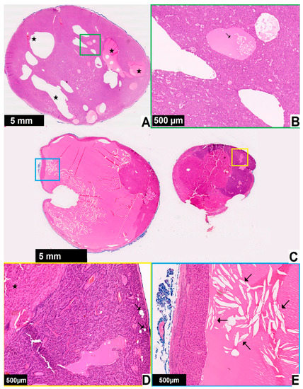 Pathomorphological images in two patients with cystic parathyroid glands ((A,B)—patient 1, (C–E)—patient 2). Black magnification bar in the bottom left corner represents the corresponding 5 mm or 500 μm distance on each image. The enlarged areas are marked with the frames of corresponding colors: (A) parathyroid gland from a patient with primary hyperparathyroidism and enlargement of a single gland, no fat tissue is present and cyst formation (star) can be seen; (B) at higher magnification some cystic spaces are filed with eosinophilic material with a few chief cells within it (arrow), the case was diagnosed as parathyroid adenoma with cyst formation; (C) one of the parathyroid glands from a patient with primary hyperparathyroidism, the growth pattern is nodular; (D) higher magnification shows the lesion (star) and parathyroid parenchyma with remaining fat cells (arrows); (E) there is a large cystic space with eosinophilic material and cholesterol clefts (arrows), the case was diagnosed as parathyroid nodular hyperplasia with cystic degeneration.