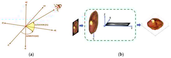 Figure 1a shows the line of sight in the 3D view context. This line starts at the center of the plot and points toward the camera or eye. As can be seen, two angles, the azimuth and the elevation, are the pillars of the line of sight. In this context, it can be understood that larger and noise–free images would be the key to achieving a better view of image objects’ details before further processing. Therefore, preprocessing operations, such as image upscaling (via interpolation) and/or image filtering (via outlier removal), can help to leverage CE image quality in this direction. It is important to note that a particular emphasis was put on exposing and exploring the impact of the indeterminate selection of the angle of the line–of–sight for meaningfully visualizing the content of the reconstructed 3D surfaces from 2D images.