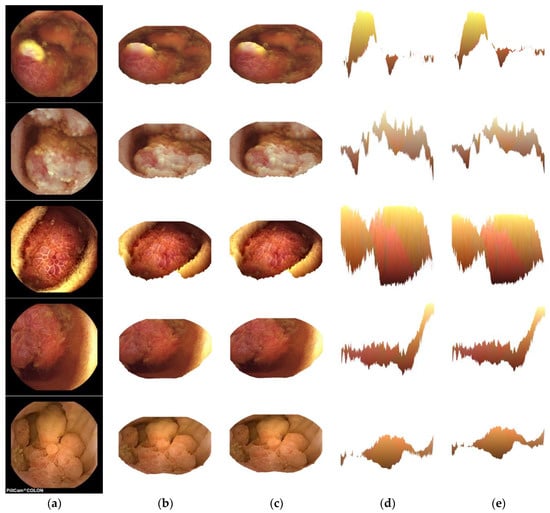 Figure 2 shows three main columns, mainly (a), (b–c), and (d–e). The (a) column shows original CE images. Knowing whether these CE images contained bowel diseases was out of the scope of this work. Results presented in Figure 2 focused on demonstrating the need for determinate selection of the line–of–sight to better view 3D structures that contain these images. As can be seen, the (b) and (c) columns showed images that had 3D surfaces good and relevant enough to allow gastroenterologists to see the contents of 3D versions extracted from 2D CE images. However, the (d) and (e) columns showed images in which the structural contents were difficult to understand or find their relevance to the input images contents, showed in column (a). The reason for the lack of relevance of 3D surfaces was due to the elevation angle selected for images shown in columns (d) and (e). Here the EL = 0° while for columns (b) and (c), the EL = −80°. In both cases, the AZ = 0°. This demonstrated that, if not carefully selected, the angles of the line-of-sight could negatively affect the meaningfulness of the reconstructed 3D surfaces. In this context, a potential and promising solution would be to have reconstructed 3D surfaces printed in 3D objects to allow medical experts or gastroenterologists to directly observe them without 2D computer screen restrictions or related errors. Now, considering each of the five columns separately, it could be seen that (b) and (d) columns contained original or non-preprocessed images while (c) and (e) contained preprocessed images. Comparing the images in columns (b) and (c), as well as in columns (d) and (e), the images looked almost the same way (unless one zoomed in–and in such a case, it would be possible to notice differences in terms of smoothness of edges). In this way, the preprocessing did not significantly improve the quality of CE images, thus introducing the need for further research in this preprocessing direction.