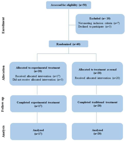 A single-blind, randomized, controlled pilot study was performed at the Child Neuropsychiatry service of the IRCCS Centro Neurolesi “Bonino Pulejo” in Messina, Italy. This study was carried out in accordance with the Declaration of Helsinki; furthermore, it was examined and approved by the Ethical Committee IRCCS Sicilia Centro Neurolesi “Bonino-Pulejo”; this clinical trial adheres to CONSORT guidelines [25], and has been registered in http://www.clinicaltrials.com (accessed on 5 June 2023) (identifier: NCT05879952). See detailed information about the CONSORT flow-chart of the study in Figure 1. Written informed consent was obtained from both caregivers or a legally authorized patient representative.