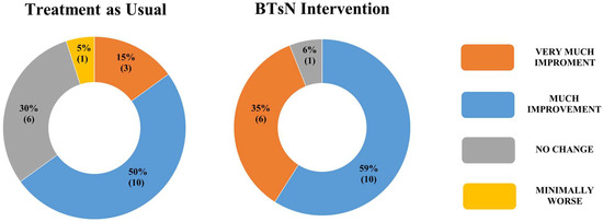 Graphic distribution of raw scores related to CGI-Improvement in children who have completed training with BTsN compared to children who have completed treatment as usual.