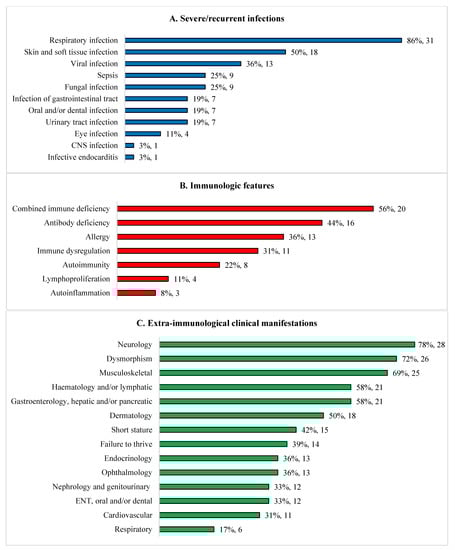Clinical and immunological features of 36 children with syndromic immunodeficiencies. (A) Severe/recurrent infections. (B) Immunological features. (C) Extra-immunological clinical manifestations. CNS, central nervous system; ENT, ear, nose and throat.