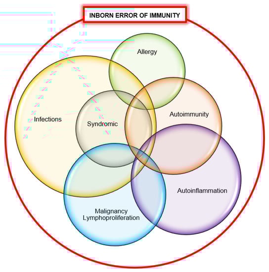 - Thalhammer, J.; Kindle, G.; Nieters, A.; Rusch, S.; Seppanen, M.R.J.; Fischer, A.; Grimbacher, B.; Edgar, D.; Buckland, M.; Mahlaoui, N.; et al. Initial presenting manifestations in 16,486 patients with inborn errors of immunity include infections and noninfectious manifestations. J. Allergy Clin. Immunol. 2021, 148, 1332–1341. [Google Scholar] [CrossRef] [PubMed]