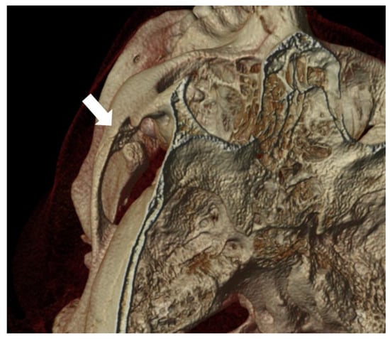 Three-dimensional reconstruction of computed tomography scan in a patient with Jacob disease. The white arrow shows the pseudojoint formation between the zygomatic bone and the elongated coronoid process of the mandible.