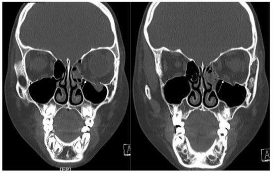 Case 1. Preoperative facial CT scan (coronal view) of the 8-year-old male patient with left inferomedial orbital wall fracture. The fracture sites were designated with white arrows.
