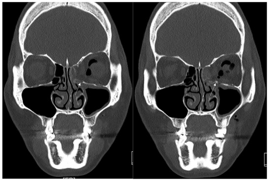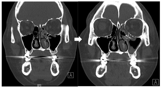 Case 2. Preoperative facial CT scan (coronal view) of the 48-year-old female patient with left inferomedial orbital wall fracture. The titanium-reinforced porous polyethylene (TR-PPE) plate was placed on the inferomedial orbital wall using a single screw at the inferior orbital rim. (White arrow).