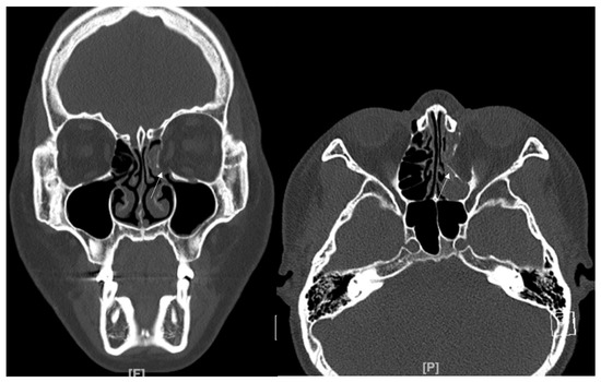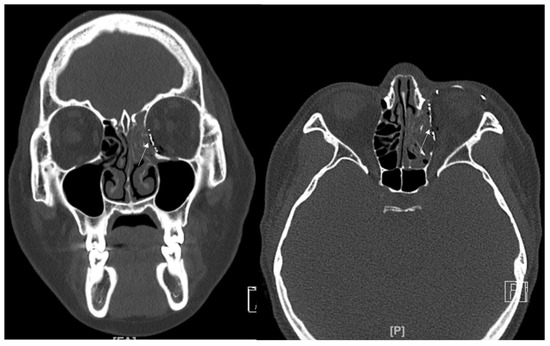 Case 3. Preoperative facial CT scan (coronal and axial view) of the 34-year-old female patient with left medial orbital wall fracture (white arrow). The fracture sites were designated with white arrows.