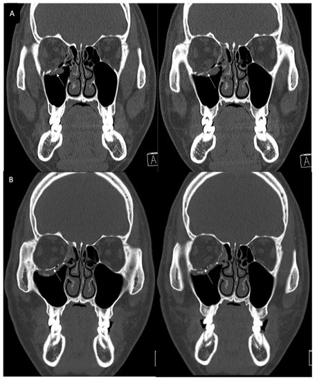 - Shim, W.S.; Jung, H.J. Management of Orbital Blowout Fractures: ENT Surgeon’s Perspective. J. Rhinol. 2019, 26, 65–74. [Google Scholar] [CrossRef]