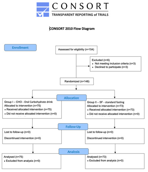 Group I (n = 75) included patients randomized to receive oral carbohydrate drinks (CHO) and Group II (n = 73) included patients randomized to serve as controls and receive standard fasting (SF). Women in Group I (CHO) received a standard oral carbohydrate drink (200 mL) with 12.5% dextrose in water (Pre-op®, N.V. Nutricia, Zoetermeer, The Netherlands) in addition to standard fasting (advised for 6 h for solids and 2 h for clear liquids). Women in Group II (SF) were advised to fast for 6 h for solids and 2 h for clear liquids as per local protocol before elective cesarean delivery.