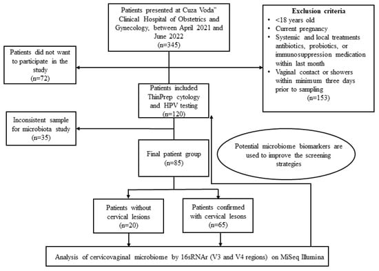 This study included 85 cervical specimens that fit the inclusion criteria from a total of 345 women who self-referred for gynecological examinations in “Cuza Voda” Clinical Hospital of Obstetrics and Gynecology between April 2021 and June 2022. The inclusion criteria for this study were as follows: women aged 18 and above, not currently pregnant, who had not taken any antibiotics, probiotics, or immunosuppression medication for at least one month prior to sampling. Additionally, participants were required to have abstained from vaginal contact or showers for a minimum of three days prior to sampling. Prior to inclusion in this study, all participants were fully informed about the purpose and details of the research and provided their informed consent by signing a consent form.